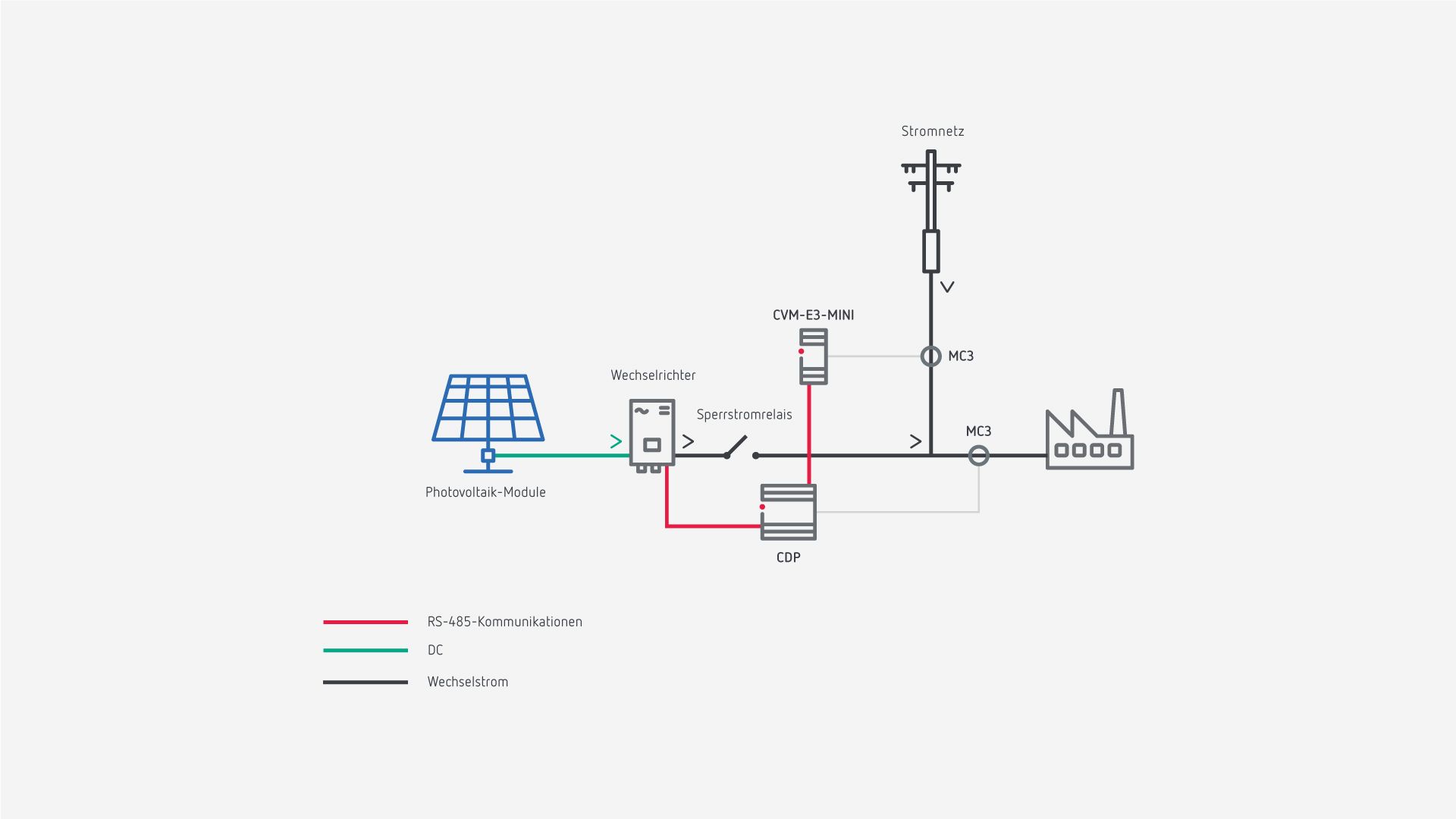 Wenn die erzeugte Menge geringer ist als die von den Verbrauchern der Anlage benötigte Energie, kombiniert das System den PV-Verbrauch mit dem Stromnetzverbrauch. Ist der Verbrauch der Anlage jedoch geringer als die erzeugte Energie, sendet der CDP-Controller einen Sollwert an den PV-Wechselrichter, um die Energieerzeugung zu stoppen und nur so viel Energie zu verbrauchen, wie zur Deckung des notwendigen Verbrauchs erforderlich ist, ohne den Überschuss in das Verteilungsnetz einzuspeisen.