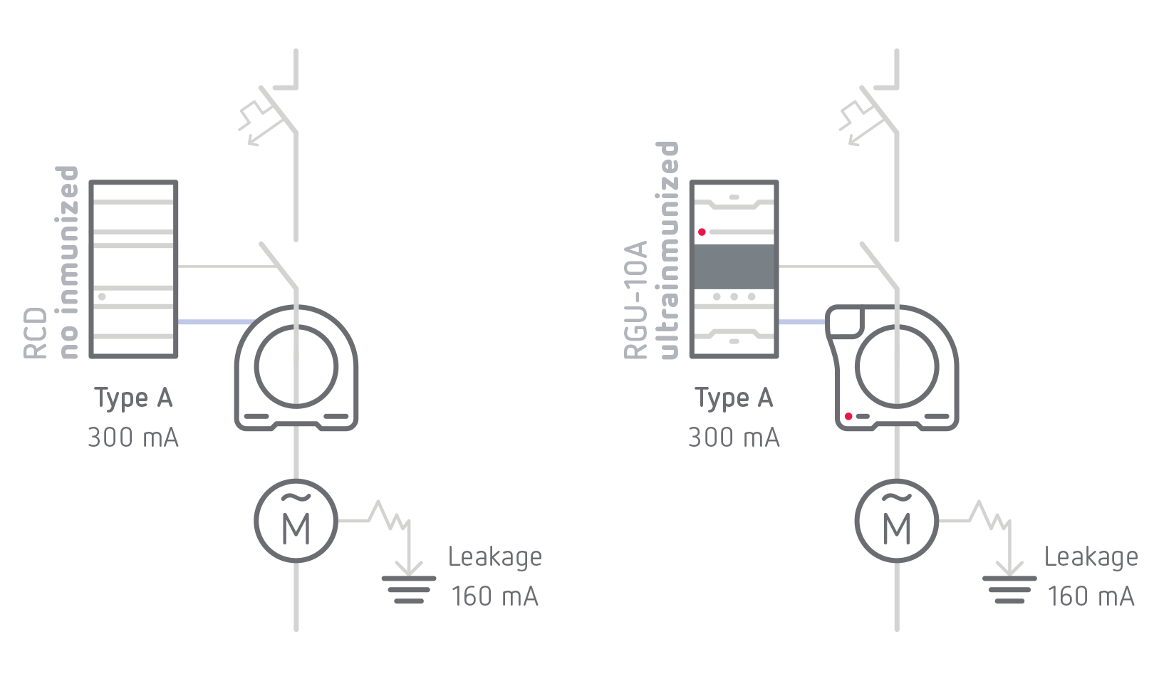 Trip margin between 85%-100% of the sensitivity range. A residual current relay can trip above 50% of its rating (IEC 60947-2-M). Ultraimmunized devices trip at a minimum of 85%, only actuating when necessary.