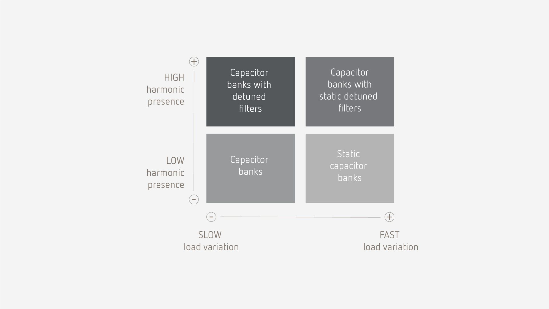 The choice of capacitor bank will depend on the types of loads in the installation. As a result, the right choice depends on the working conditions of each industry. There are four basic types of batteries, and which one to choose will vary based on two aspects: Does the load vary slowly or quickly? Are there harmonics in the installation?