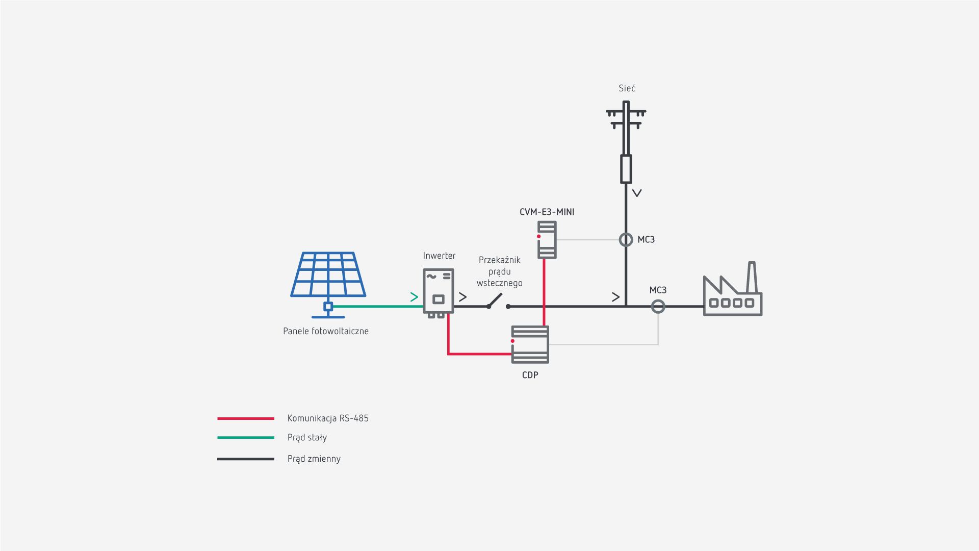 Jeśli ilość generowanej energii jest niższa niż wymagana przez odbiorniki instalacji, system połączy pobór energii słonecznej z poborem z sieci. Jeśli jednak zużycie energii z instalacji jest niższe niż energia wytworzona, regulator CDP wyśle polecenie do falownika, aby wstrzymać wytwarzanie, zużywając tylko tyle energii ile potrzeba na pokrycie wymaganych poborów, tym samym unikając przesyłki nadwyżki do sieci dystrybucyjnej.