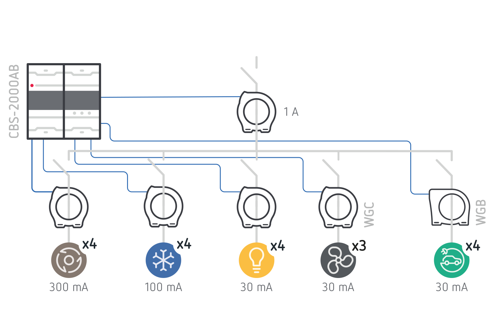 Amplo intervalo de correntes de fugaGere fugas acumuladas na cabeceira da instalação, em subquadros ou rever as produzidas diretamente nas cargas. Para tal, dispomos de um amplo intervalo de transformadores de proteção WGC com secções desde 20 mm até 500 x 200 mm.